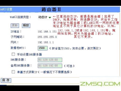 2。设置B路由器的IP地址,路由器的WAN口地址,该地址是自动分配一个路由器可以手动设置,如何设置手动设置,检查地址不在路由器的dhch地址池,否则会造成冲突。
